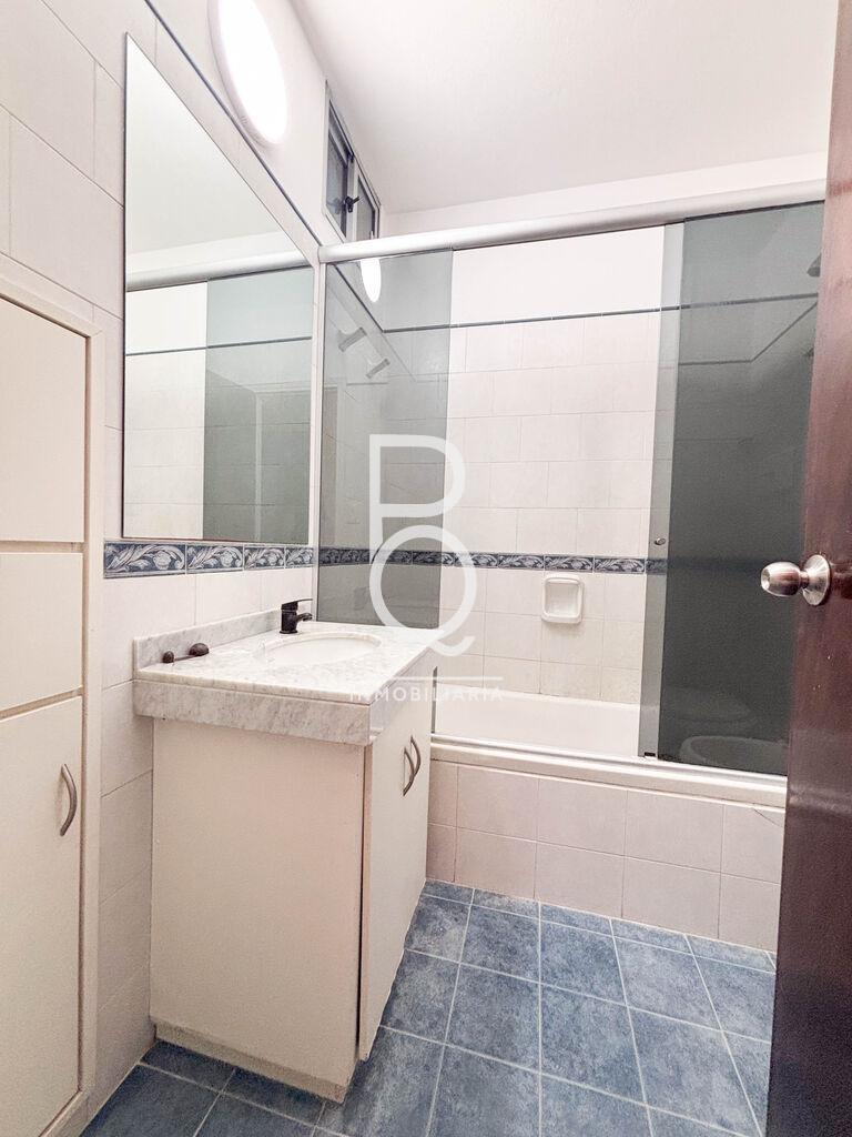 - Un baño completo con bañera y mampara.