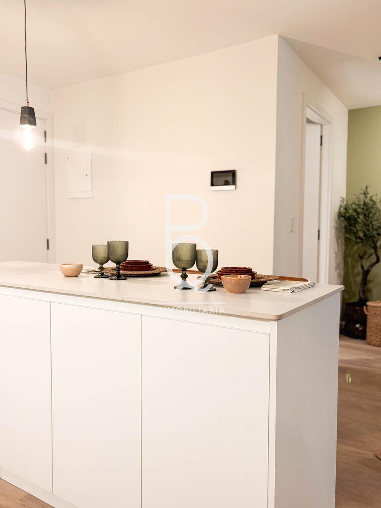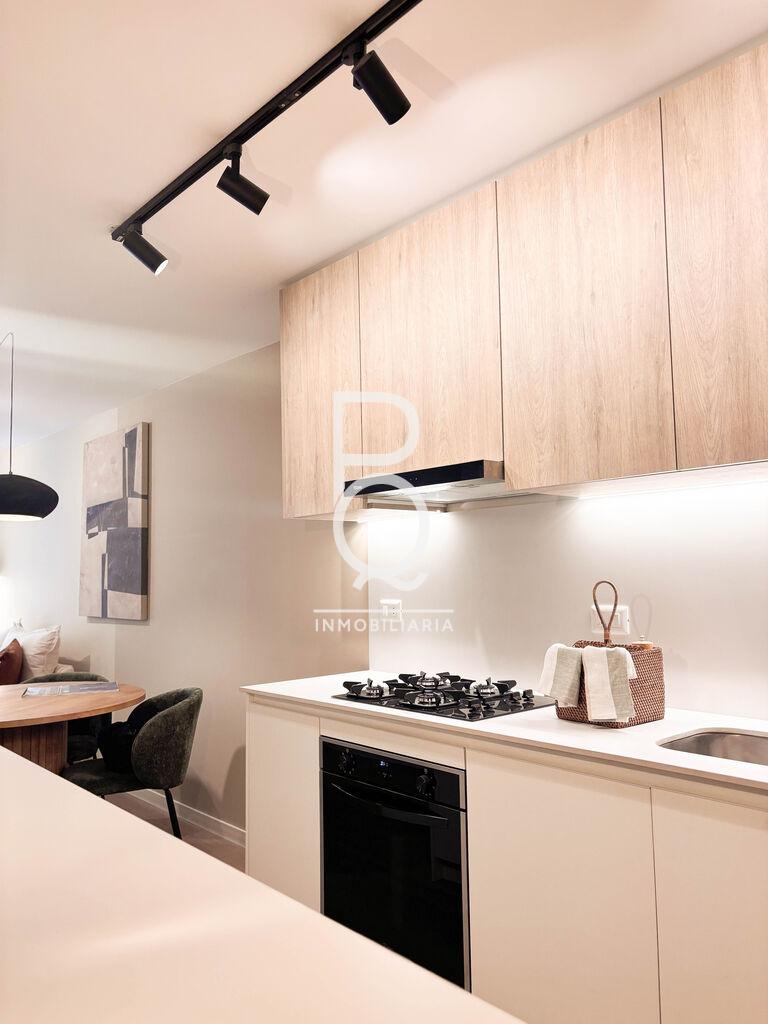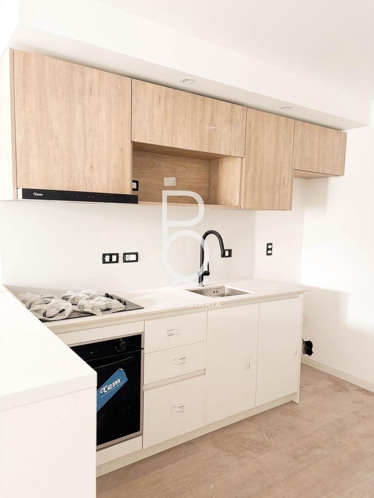 Se compone de living-comedor con cocina integrada. La cocina incluye mesada, placares bajo y sobre mesada, horno empotrado, anafe, campana extractora y barra tipo isla con mueble inferior.